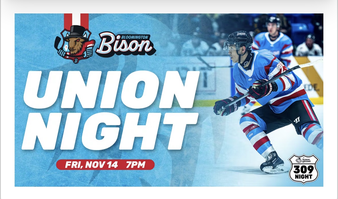 Join the Bloomington Bison for Union Night on November 14th at 7pm as they celebrate and honor the hardworking union members who keep our community strong!